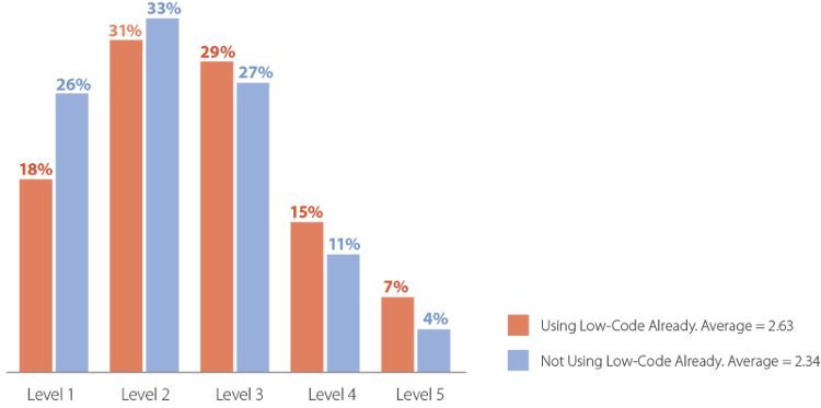 When we compared DevOps maturity between organizations that were and were not using low-code, as can be seen in these charts, users of low-code rated their DevOps maturity higher than organizations that were not using low-code.
