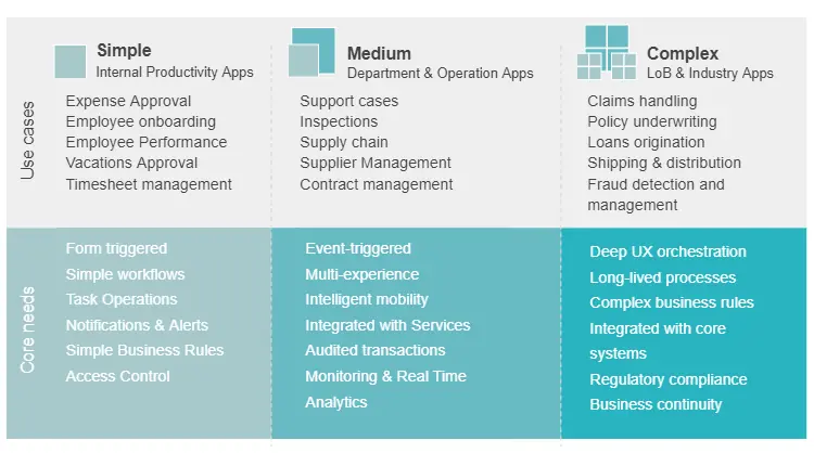 Right in the middle, the medium processes are usually event-triggered, multi-experience processes that need to be integrated with services. They require an audit trail, monitoring, and real-time analytics. Medium-complexity processes often translate to department and operations type apps, such as ticketing systems or customer service apps.