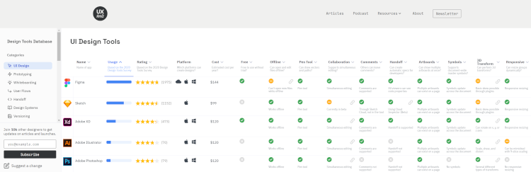 You can use comparison websites like UXTools that show you the different tools available for different design categories, and relevant information like subscription costs, features, and user adoption rate.