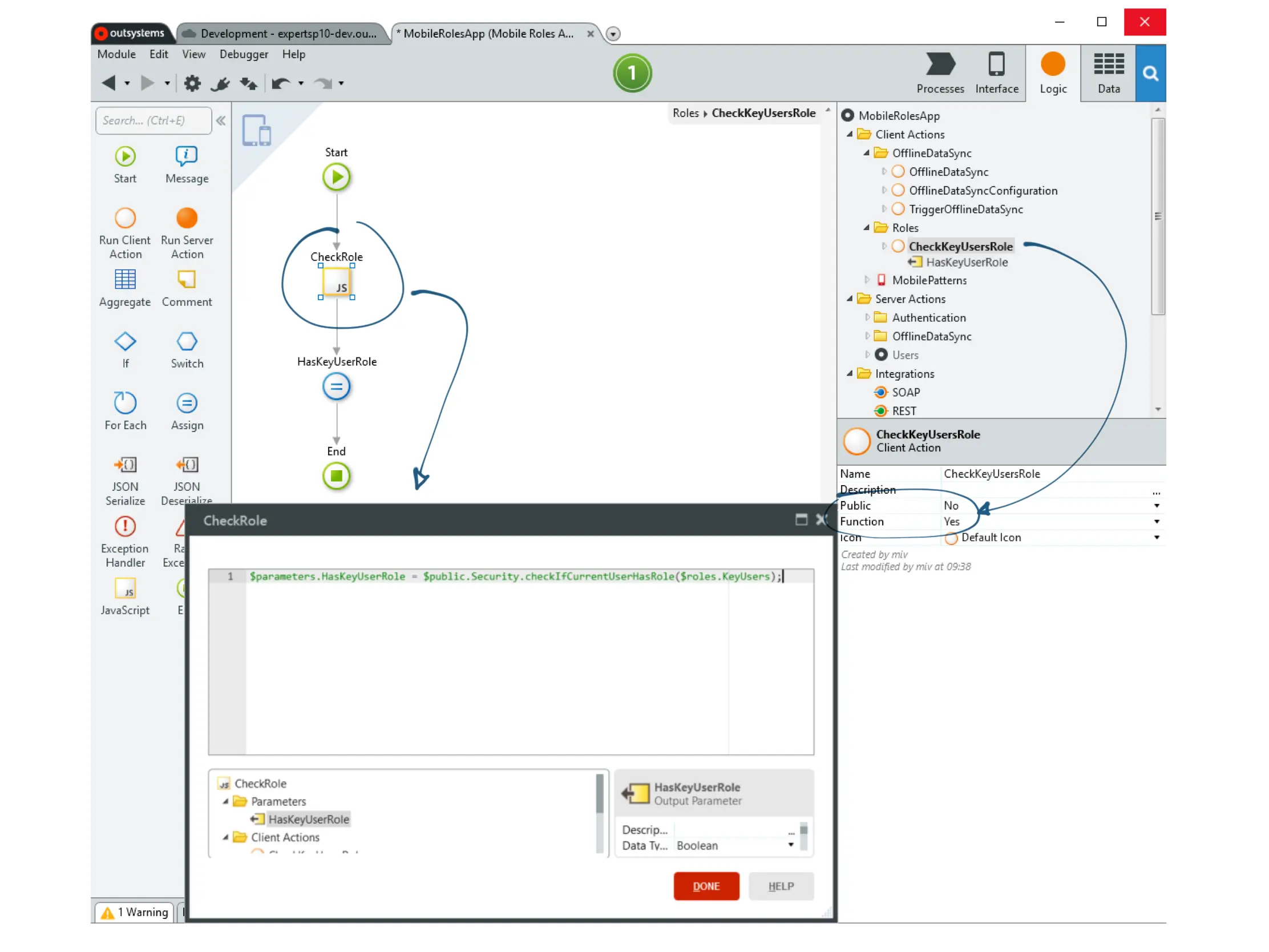 - Add JavaScript to your action, add an output parameter to your JavaScript, and create the role check call. Use this code sample to create your own: