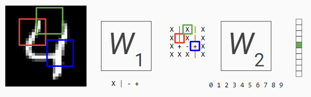 So what is the problem over here? What makes a number look like four is not the fact that a particular area of an image has ink or no ink. It's how the inked lines are matched against each other, independent of their absolute placement in the image. With a single matrix multiplication, we can't have a notion of independent lines and shapes of the image. We can only score categories based on absolute positions of the image.