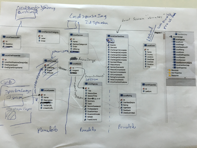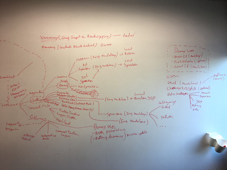 Now that we had the flows, it was time start to drawing the screens and adding the offline synchronization aspects. For this, we used the good old wall and pen.