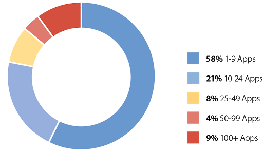 According to the same research, and as shown in the following chart, the level of demand for application development seems higher than ever. Focusing on organizations with 500 or more employees, we found 42% have 10 or more apps planned for delivery in 2018. Twenty-one percent have 25 or more apps planned in 2018.