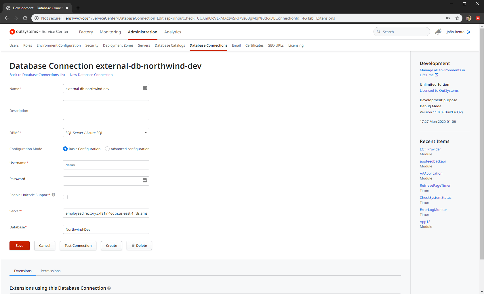 OutSystems integrates with existing databases so developers do not have to worry about data migration. These database connections are centrally managed in the environment management console.