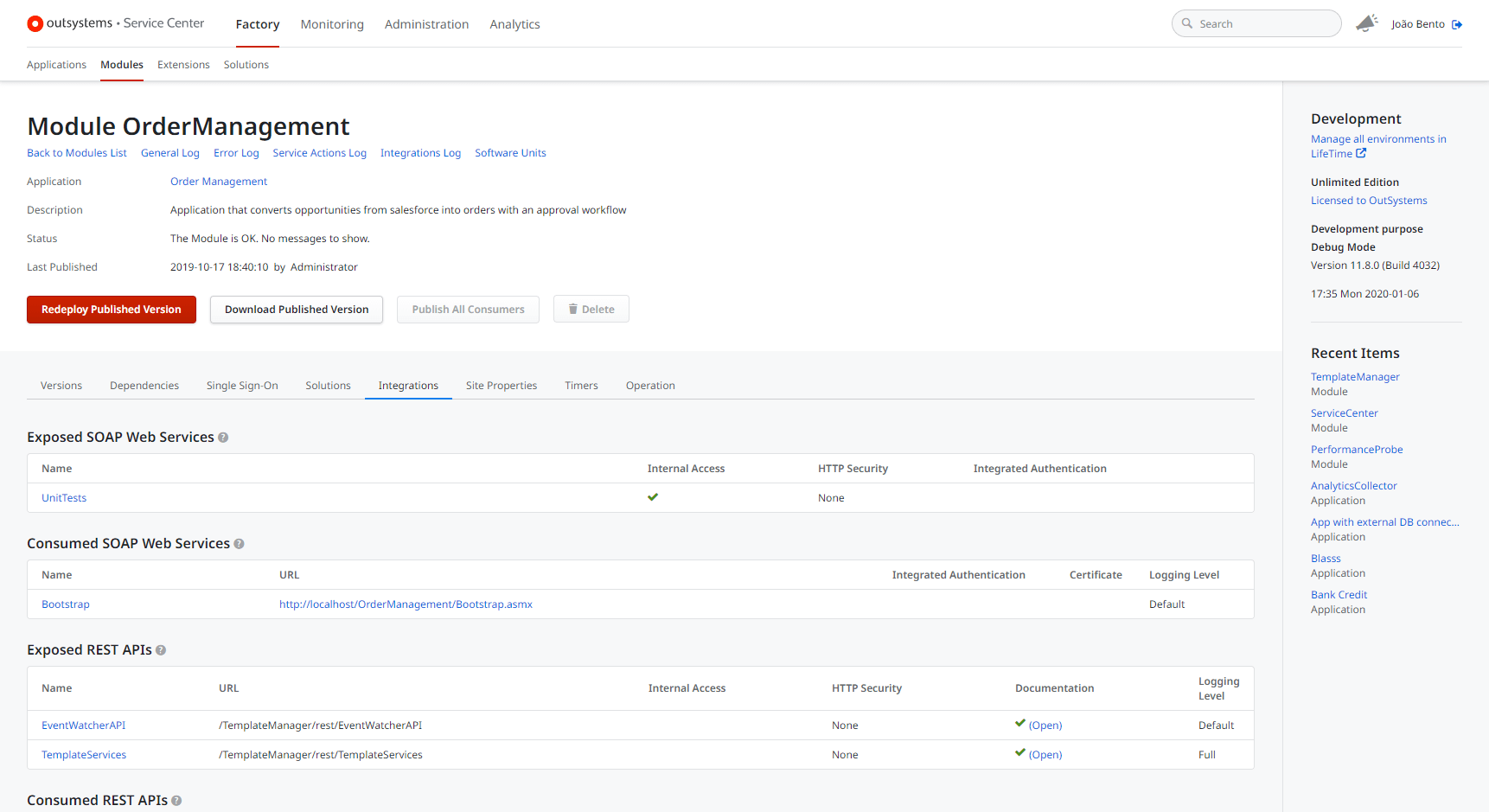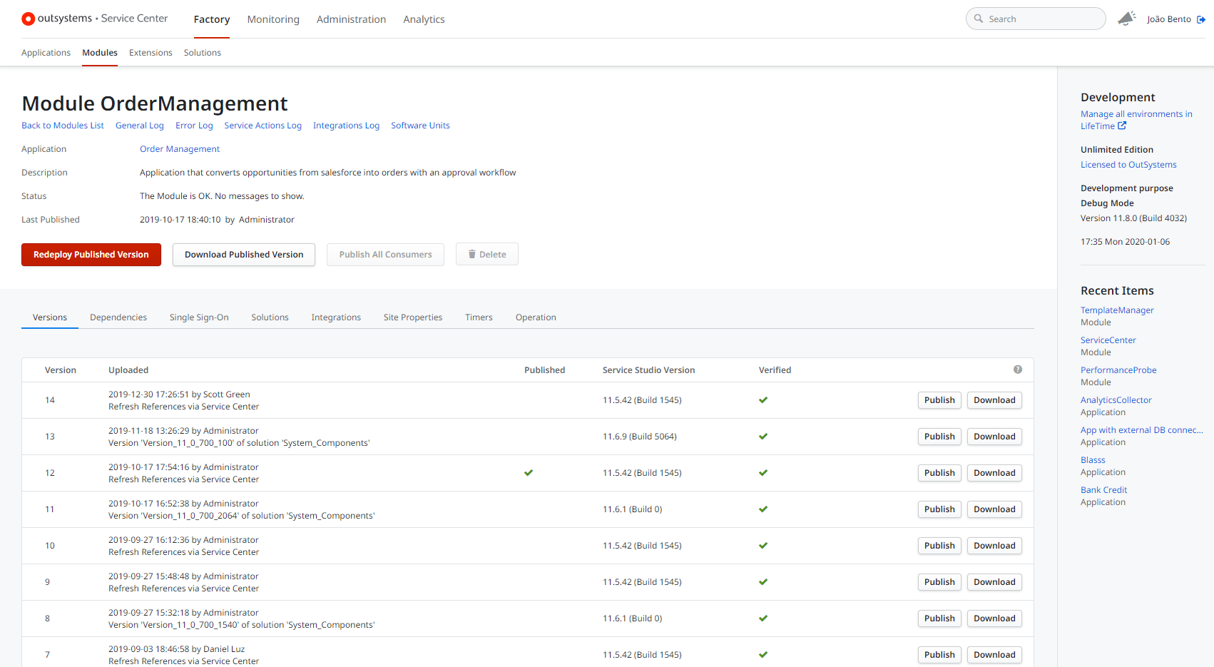 Application and integration components versions are automatically managed by OutSystems. It is possible to see all versions that were published, by whom and when: