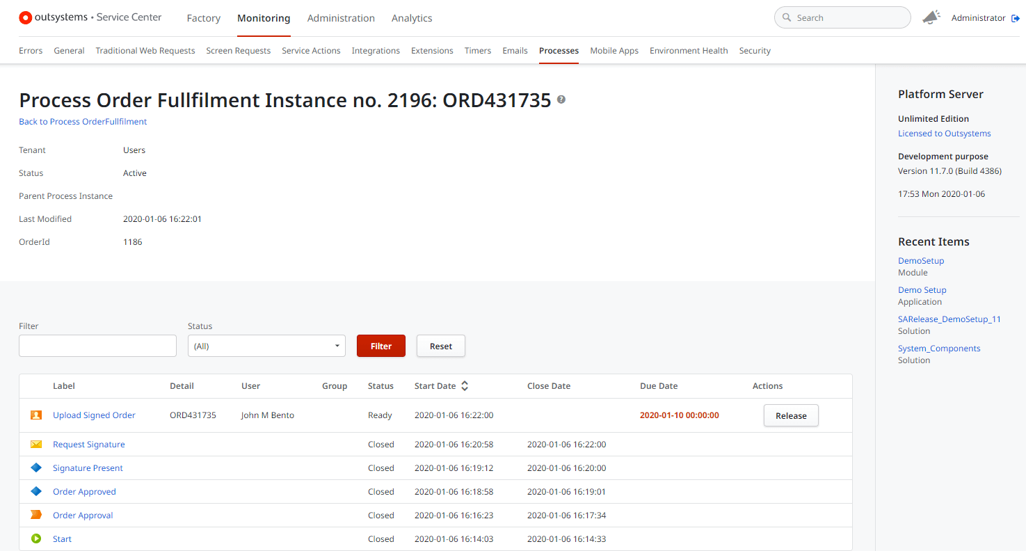Business processes can also be monitored and managed. For example, a process can be suspended for a certain period of time.