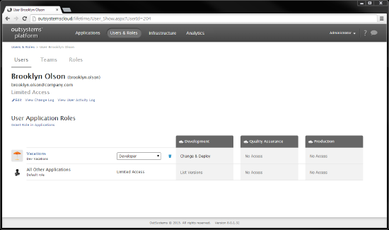 In this example, Brooklyn's default role allows her to list the applications in development. But for the Vacations application, we assigned her the Developer role. She can now change the Vacations application in Development and nothing else: