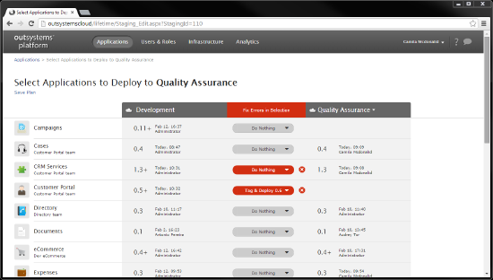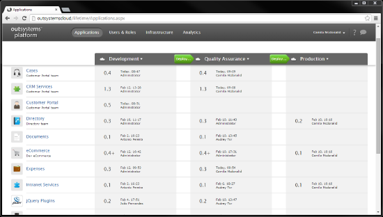 With OutSystems, deploying a complex app to production is simple and doesn't require specialized skill sets (scripting or maven experts). It offers automated staging across environments with full dependency analysis, no downtime and automated rollback capabilities. It also offers governance and separation of duties by managing the roles, permissions and security policies for all environments. OutSystems version control system allows tagging and hotfix detection.