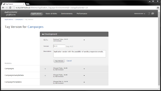 With OutSystems, it is possible to take a snapshot of the application and its modules, tag it with a version, and use it for deploying. This is usually done when the application development is stable or a milestone is reached, allowing for retrieving that state of the application and its modules at any time. It automatically provides suggestions to tag a minor version, major version, or custom tag.