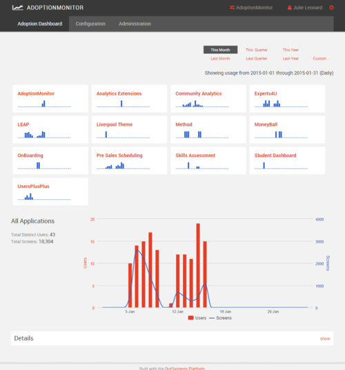 In OutSystems Forge, there is the AdoptionMonitor application. It leverages the logging information made available by OutSystems to build a dashboard that shows which users are accessing factory applications, This dashboard provides insight to when and how often they're used, gathering trends over time and delivers valuable data on how well certain applications are being received by users.