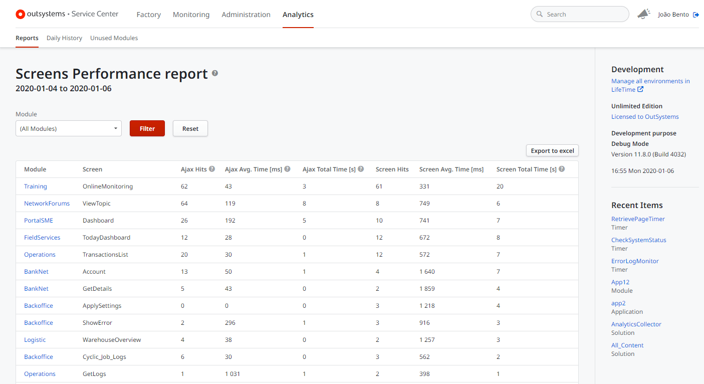 OutSystems has a rich performance monitoring dashboard that makes it easy to understand performance bottlenecks and take action. The execution times of all queries, web service invocations, screen renderings, schedulers and invocations to adapters, external systems or custom APIs are tracked asynchronously. Performance reports from the management console provide valuable tuning and optimization information for applications. Moreover, no extra frameworks need to be enabled or developed to take those measures. The goal is to help teams quickly and efficiently provide support to any issues that might arise.