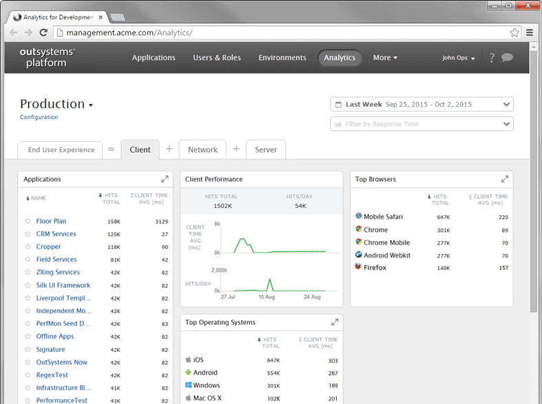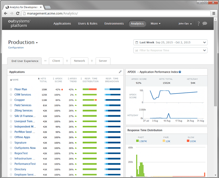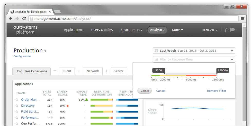 OutSystems measures the end-user experience based on industry standard indicators of user satisfaction. With this measurement in place, developers will know how users feel about the applications and will have the ability to further drill down in the information provided to proactively detect, troubleshoot and solve performance issues even before end-users report them.