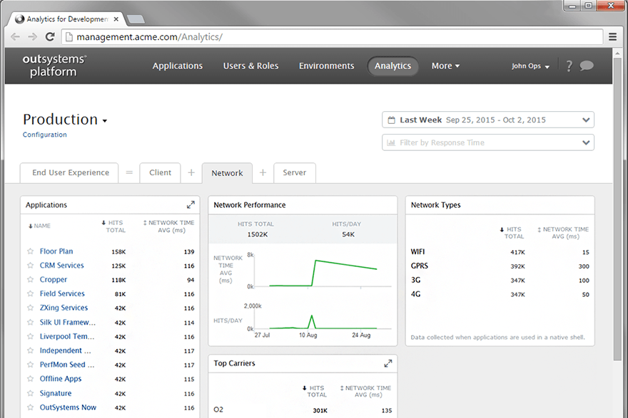 OutSystems enables teams to quickly drill down on network problems. This is useful for identifying performance issues that only manifest themselves with certain network conditions. An example would be a particular page that's slow only over 3G networks. Network monitoring detects it and then makes it visible to the team, who could optimize the application to send less data to the device.